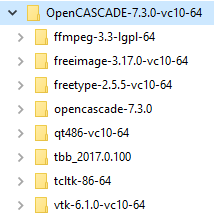 When the installation is complete, you will find the directories for 3rd party products (some might be absent in case of custom installation) and the main OCCT directory: