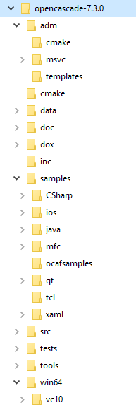 The contents of the OCCT-7.4.0 directory (called further "OCCT root", or $CASROOT) are as follows: