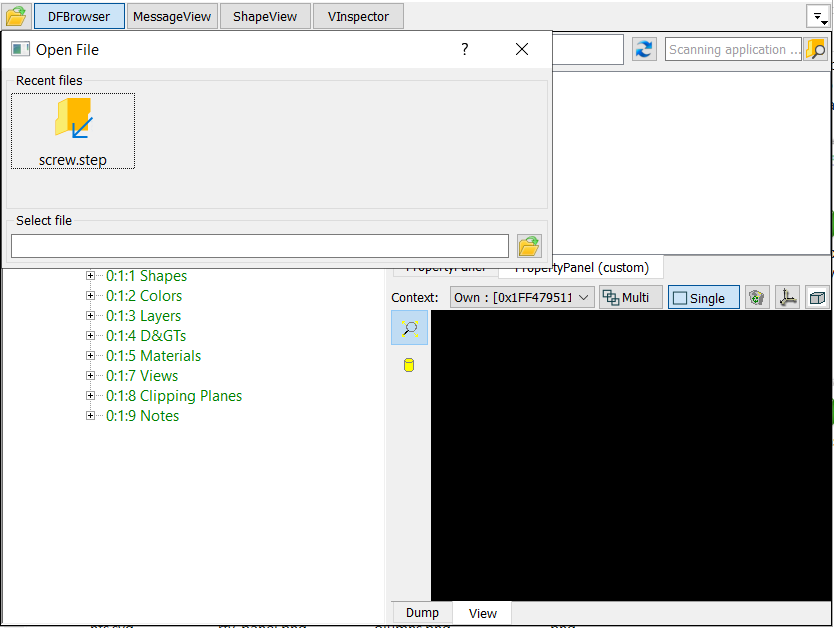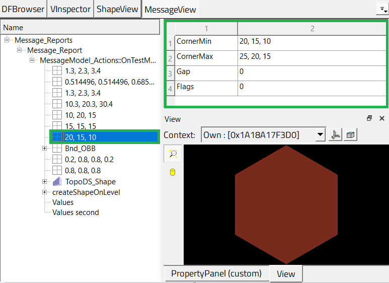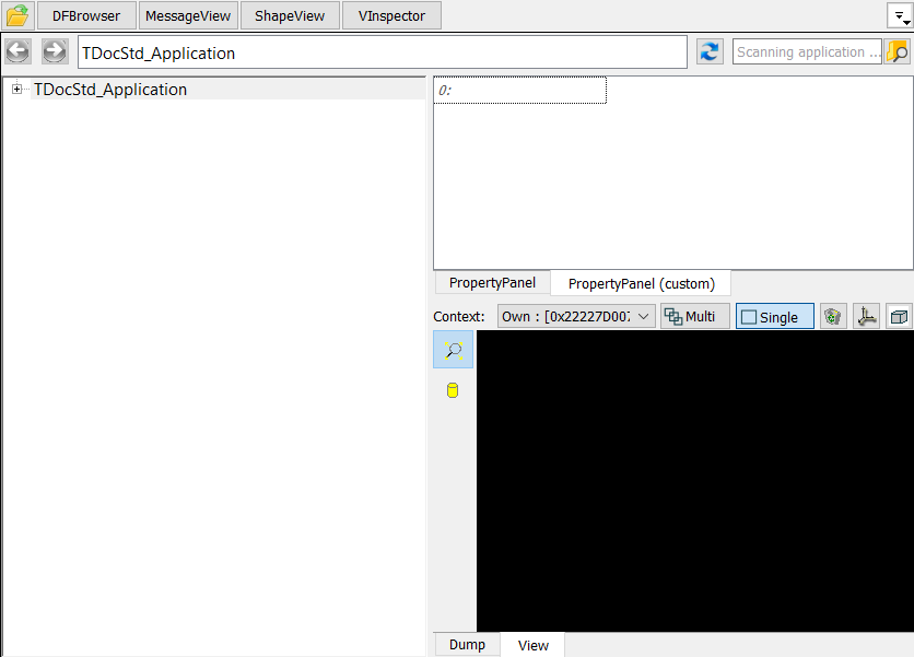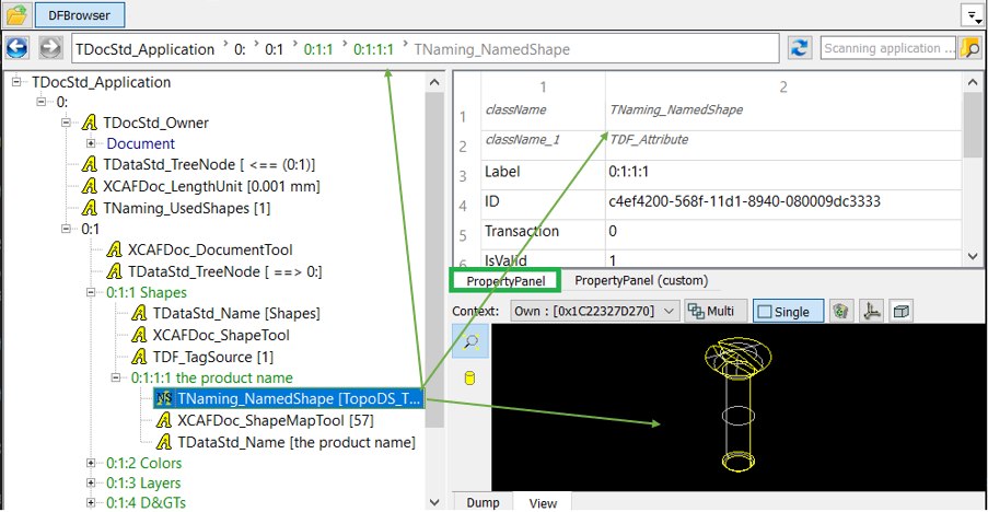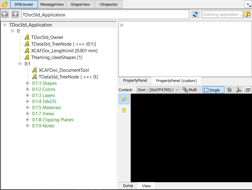Property panel is used to display the result of TDF_Attribute::Dump() or TDF_Label::Dump() of the selected tree view item. The information is shown in one table.