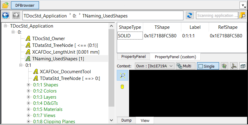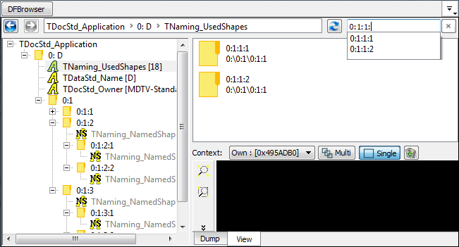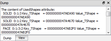 Dump view shows the result of TDF_Attribute::Dump() or TDF_Label::Dump() of the selected tree view item.