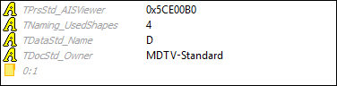 | TDF_Attribute | Attribute | attribute type [additional information] | A child of a Label. It has no children. Text view is the attribute type *(DynamicType()->Name()* of TDF_Attribute) and additional information (a combination of attribute values). |