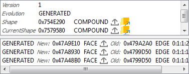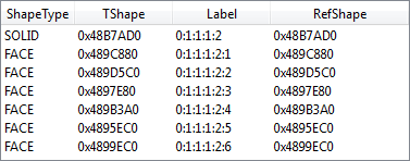 | TNaming_NamedShape | 2 controls: - a table of [method name, value] including CurrentShape/OriginalShape methods result of TNaming_Tools, - an evolution table. Tables contain buttons for TopoDS_Shape export. |