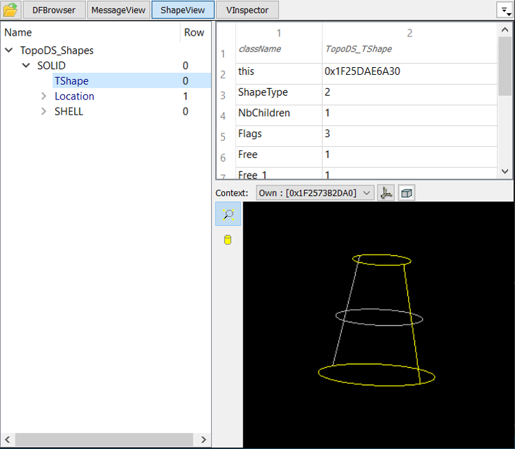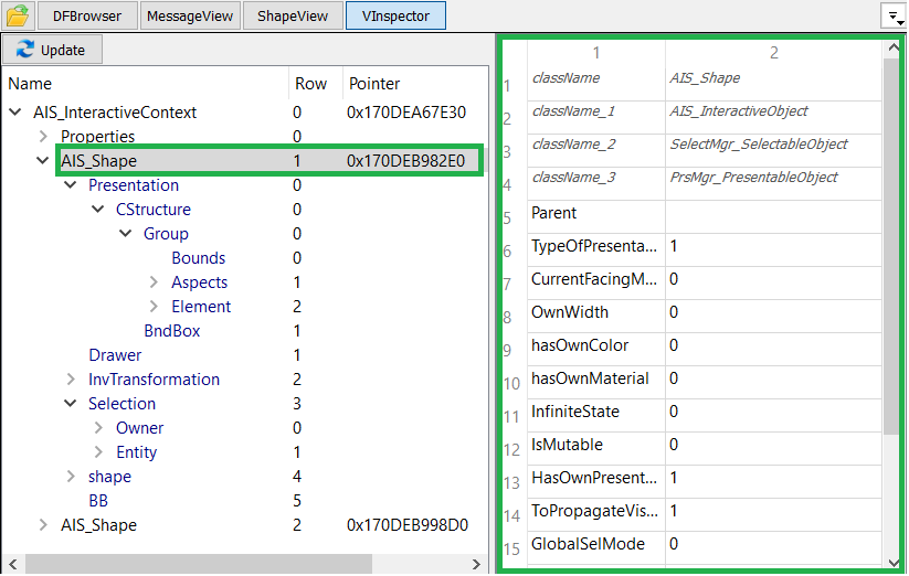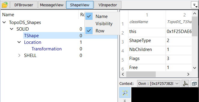 This control shows presentation hierarchy of the investigated OCCT element, e.g. TDocStd_Application for DFBrowser, see Overview. The first column contains the name, other columns are informative.