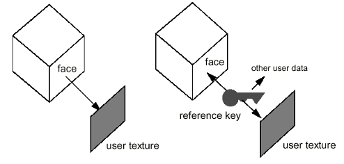 On a single reference-key, many attributes can be aggregated; the application can ask at runtime which attributes are available. For example, to associate a texture to a face in a geometric model, both the face and the texture are attached to the same reference-key.