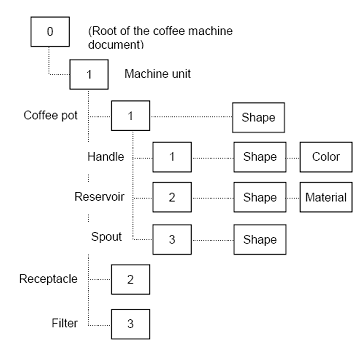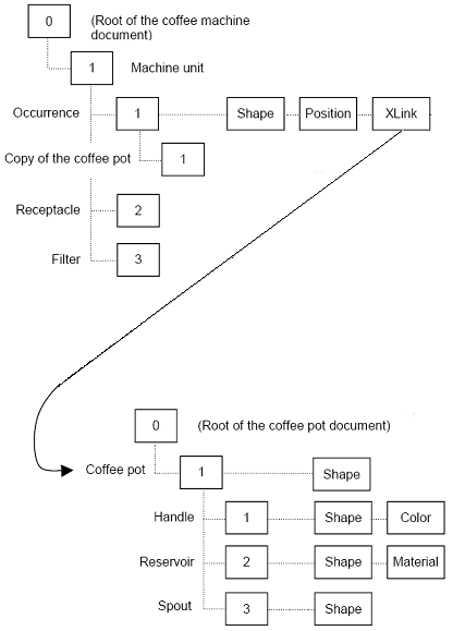 The nesting of labels is key to OCAF. This allows a label to have its own structure with its local addressing scheme which can be reused in a more complex structure. Take, for example, the coffee machine. Given that the coffee pot's handle has a label of tag [1], the entry for the handle in the context of the coffee pot only (without the machine unit) is [0:1:1]. If you now model a coffee machine with two coffee pots, one at the label [1], the second at the label [4] in the machine unit, the handle of the first pot would have the entry [0:1:1:1] whereas the handle of the second pot would be [0:1:4:1]. This way, we avoid any confusion between coffee pot handles.