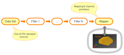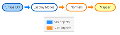 The low-level scenario of VIS usage in VTK pipeline is shown in the figure below. The Mesher component produces shape facet (VTK polygonal data) using implementation of IShapeData interface. Then result can be retrieved from this implementation as a vtkPolyData instance.