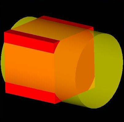 In this example the cylinder (shown in yellow and transparent) is subtracted from the box (shown in red). The cylinder is shifted by 5e-5 relatively to the box along its axis (the distance between rear faces of the box and cylinder is 5e-5).