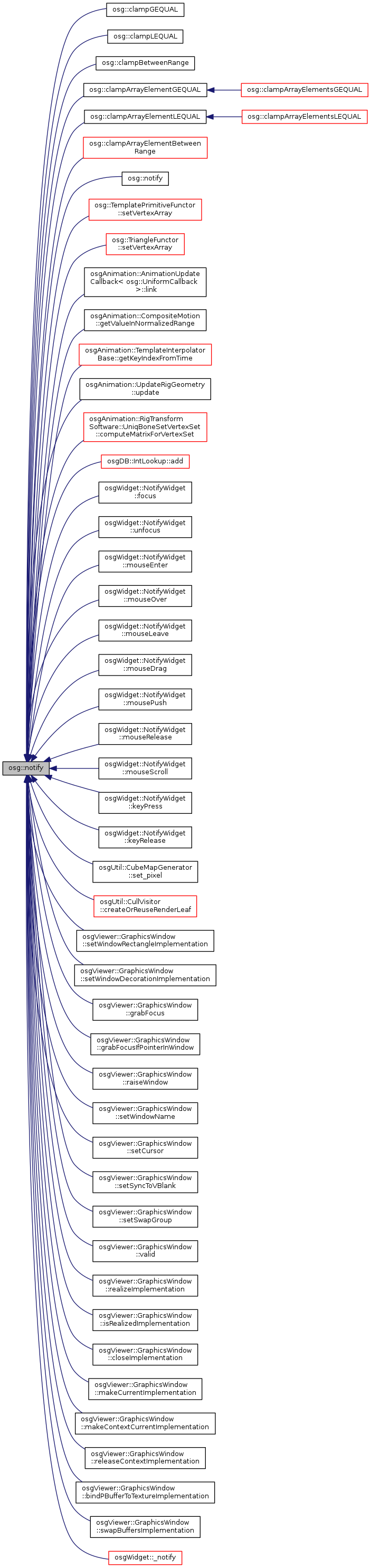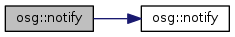 All tell the osg to redirect all debugging and more important messages to the notification stream (useful for debugging) setting ALWAYS will force all messages to be absorbed, which might be appropriate for final applications. Default NotifyLevel is NOTICE. Check the enum NotifySeverity for full range of possibilities. To use the notify with your code simply use the notify function as a normal file stream (like std::cout) i.e