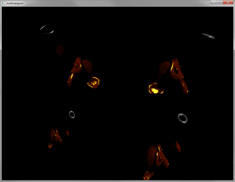 Multi Viewport renders a Scenegraph from the point of view of four virtual cameras into the four quadrants of a window. This is a common configuration for 3D CAD or modelling tools or could be adjusted to help with rendering a rear-view mirror in a car racing game or a CCTV camera display.