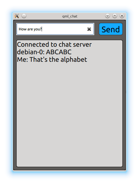 The Bluetooth QML Chat example implements a simple chat program between two parties. The application acts as client and attempts to connect to a Bluetooth socket server. It uses the BluetoothDiscoveryModel type to find the server and BluetoothSocket type to facilitate the data exchange.