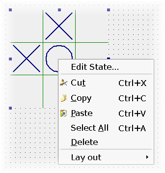 The editState() slot is called whenever the user chooses the Edit State... option in a TicTacToe widget's task menu. The slot creates a TicTacToeDialog presenting the current state of the widget, and allowing the user to edit its state by playing the game.