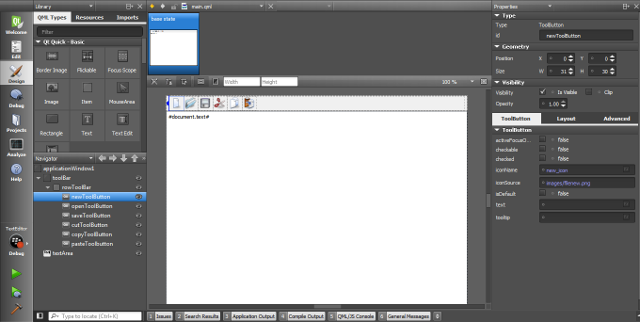 For example, the New tool button has newIcon set as its iconName and images/filenew.png set to the iconSource property. The icons are also viewable in the Resources inside the Library window.