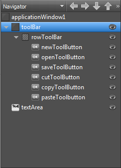 Within the tool bar, we need a row layout. Drag the row layout into the Navigator window and set it to be a child of the tool bar.