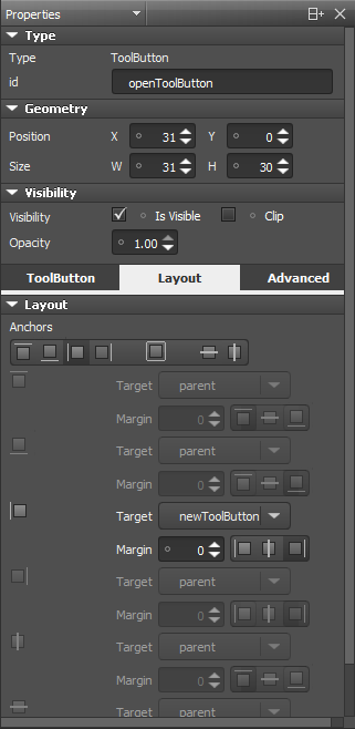 0. These settings makes sure that the tool buttons are adjacent to each other. - Set the iconName and iconSource properties in the ToolButton tab. The iconName should be set to a unique name identifying the icon name while the iconSource property should be set to the name of the icon for the tool button.