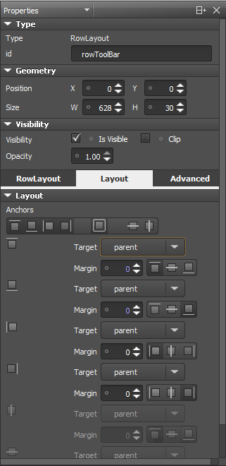 - The first tool button, for example New, should have the left anchor set to the row layout.
