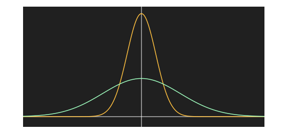 The image above shows the Gaussian function with two different deviation values, yellow (1) and cyan (2.7). The y-axis shows the weights, the x-axis shows the pixel distance.