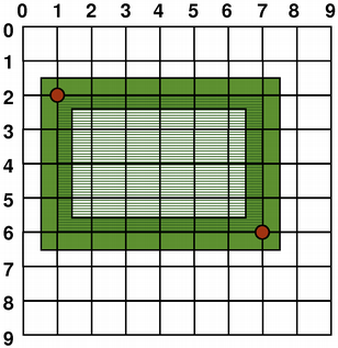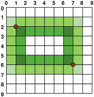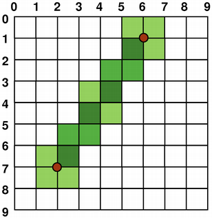 QPainter painter(this); painter.setPen(Qt::darkGreen); painter.drawRect(1, 2, 6, 4); | QPainter painter(this); painter.setPen(Qt::darkGreen); painter.drawLine(2, 7, 6, 1); |