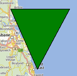 The following snippet shows a MapPolygon being used to display a triangle, with three vertices near Brisbane, Australia. The triangle is filled in green, with a 1 pixel black border.
