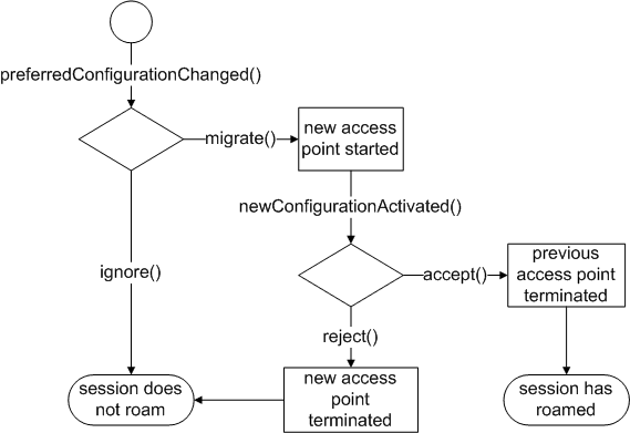 Applications may connect to the preferredConfigurationChanged() signal in order to receive notifications when a more suitable access point becomes available. In response to this signal the application must either initiate the roaming via migrate() or ignore() the new access point. Once the session has roamed the newConfigurationActivated() signal is emitted. The application may now test the carrier and must either accept() or reject() it. The session will return to the previous access point if the roaming was rejected. The subsequent state diagram depicts the required state transitions.