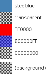 Rectangle { color: "steelblue" width: 40; height: 40 } Rectangle { color: "transparent" y: 40; width: 40; height: 40 } Rectangle { color: "#FF0000" y: 80; width: 40; height: 40 } Rectangle { color: "#800000FF" y: 120; width: 40; height: 40 } Rectangle { color: "#00000000" // ARGB fully transparent y: 160 width: 40; height: 40 }