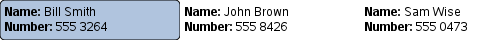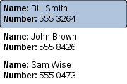 Rectangle { width: 180; height: 200 Component { id: contactDelegate Item { width: 180; height: 40 Column { Text { text: '<b>Name:</b> ' + name } Text { text: '<b>Number:</b> ' + number } } } } ListView { anchors.fill: parent model: ContactModel {} delegate: contactDelegate highlight: Rectangle { color: "lightsteelblue"; radius: 5 } focus: true } }