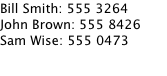 import QtQuick 2.0 ListModel { ListElement { name: "Bill Smith" number: "555 3264" } ListElement { name: "John Brown" number: "555 8426" } ListElement { name: "Sam Wise" number: "555 0473" } }