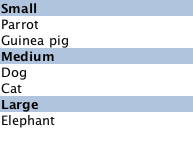 For example, here is a ListView that displays a list of animals, separated into sections. Each item in the ListView is placed in a different section depending on the "size" property of the model item. The sectionHeading delegate component provides the light blue bar that marks the beginning of each section.