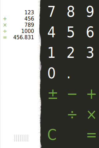 Grid { columns: 3 columnSpacing: 32 rowSpacing: 16 signal buttonPressed Button { text: "7" } Button { text: "8" } Button { text: "9" } Button { text: "4" } Button { text: "5" } Button { text: "6" } Button { text: "1" } Button { text: "2" } Button { text: "3" } Button { text: "0" } Button { text: "."; dimmable: true } Button { text: " " } Button { text: "��"; color: "#6da43d"; operator: true; dimmable: true } Button { text: "���"; color: "#6da43d"; operator: true; dimmable: true } Button { text: "+"; color: "#6da43d"; operator: true; dimmable: true } Button { text: "���"; color: "#6da43d"; operator: true; dimmable: true } Button { text: "��"; color: "#6da43d"; operator: true; dimmable: true } Button { text: "��"; color: "#6da43d"; operator: true; dimmable: true } Button { text: "C"; color: "#6da43d"; operator: true } Button { text: " "; color: "#6da43d"; operator: true } Button { text: "="; color: "#6da43d"; operator: true; dimmable: true } }
