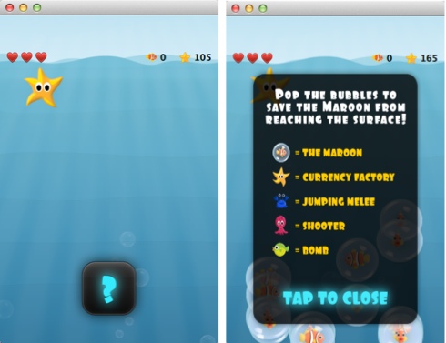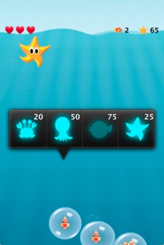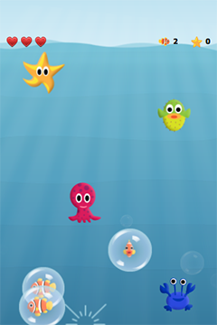 Tapping the button initiates a countdown timer that triggers the creation of the game canvas by using the GameCanvas type. Another Timer type spawns mobs of fish inside bubbles that the players must free before they reach the surface. The players can tap on the screen to open a menu where they can buy different types of weapons (melee, ranged, and bombs) to burst the bubbles.