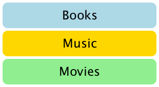 import QtQuick 2.0 Item { width: 310; height: 170 Column { anchors.horizontalCenter: parent.horizontalCenter anchors.verticalCenter: parent.verticalCenter spacing: 5 Rectangle { color: "lightblue"; radius: 10.0 width: 300; height: 50 Text { anchors.centerIn: parent font.pointSize: 24; text: "Books" } } Rectangle { color: "gold"; radius: 10.0 width: 300; height: 50 Text { anchors.centerIn: parent font.pointSize: 24; text: "Music" } } Rectangle { color: "lightgreen"; radius: 10.0 width: 300; height: 50 Text { anchors.centerIn: parent font.pointSize: 24; text: "Movies" } } } }