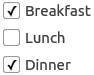 Column { CheckBox { text: qsTr("Breakfast") checked: true } CheckBox { text: qsTr("Lunch") } CheckBox { text: qsTr("Dinner") checked: true } }