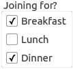 GroupBox { title: "Joining for?" Column { spacing: 10 CheckBox { text: "Breakfast" checked: true } CheckBox { text: "Lunch" checked: false } CheckBox { text: "Dinner" checked: true } } }