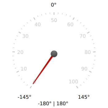 minimumValueAngle and maximumValueAngle determine not only the position of the tickmarks, labels and needle, but the direction in which they are displayed around the gauge. For example, if minimumValueAngle is greater than maximumValueAngle, the gauge will be anti-clockwise. Below, there are two gauges: the top gauge has a minimumValueAngle of -90 degrees and a maximumValueAngle of 90 degrees, and the bottom gauge has the opposite.