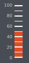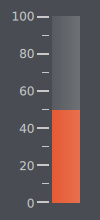 import QtQuick 2.2 import QtQuick.Controls 1.4 import QtQuick.Controls.Styles 1.4 import QtQuick.Extras 1.4 Rectangle { width: 100 height: 220 color: "#494d53" Gauge { value: 50 tickmarkStepSize: 20 minorTickmarkCount: 1 font.pixelSize: 15 anchors.centerIn: parent anchors.horizontalCenterOffset: -4 style: GaugeStyle { valueBar: Rectangle { color: "#e34c22" implicitWidth: 28 } foreground: null tickmark: Item { implicitWidth: 8 implicitHeight: 4 Rectangle { x: control.tickmarkAlignment === Qt.AlignLeft || control.tickmarkAlignment === Qt.AlignTop ? parent.implicitWidth : -28 width: 28 height: parent.height color: "#ffffff" } } minorTickmark: Item { implicitWidth: 8 implicitHeight: 2 Rectangle { x: control.tickmarkAlignment === Qt.AlignLeft || control.tickmarkAlignment === Qt.AlignTop ? parent.implicitWidth : -28 width: 28 height: parent.height color: "#ffffff" } } } } }