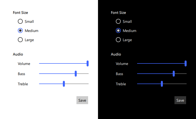 Both attributes can be specified for any window or item, and they automatically propagate to children in the same manner as fonts. In the following example, the window and all three radio buttons appear in the dark theme using a violet accent color: