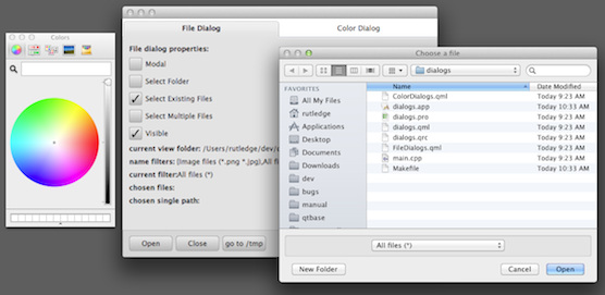 The example can be built as a standalone executable, but each type of dialog is demonstrated in a separate QML file which can also be run separately with qmlscene.