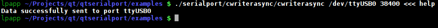 Command Line Writer Async shows how to use the QSerialPort class for sending data asynchronously over the selected serial port with the desired settings.