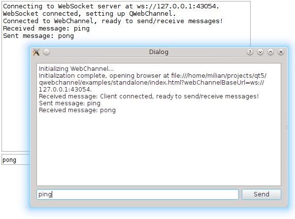 The C++ application sets up a QWebChannel instance and publishes a Dialog object over it. For the remote client side, index.html is opened. Both show a dialog with the list of received messages and an input box to send messages to the other end.