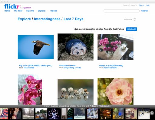 FlickrView is an example that retrieves the flickr.com RSS feed of public photos utilizing an XmlListModel and shows the thumbnails in a ListView. When clicking on a thumbnail in the list at the bottom, the full size image is loaded in a WebView using the corresponding Flickr link for it. It is also possible to browse the profile of Flickr users in the WebView like in a normal browser. This demonstrates how navigaton can be restricted to a specific domain in the onNavigationRequested signal. The feed can be updated using pull-to-refresh at the end of the thumbnail list.