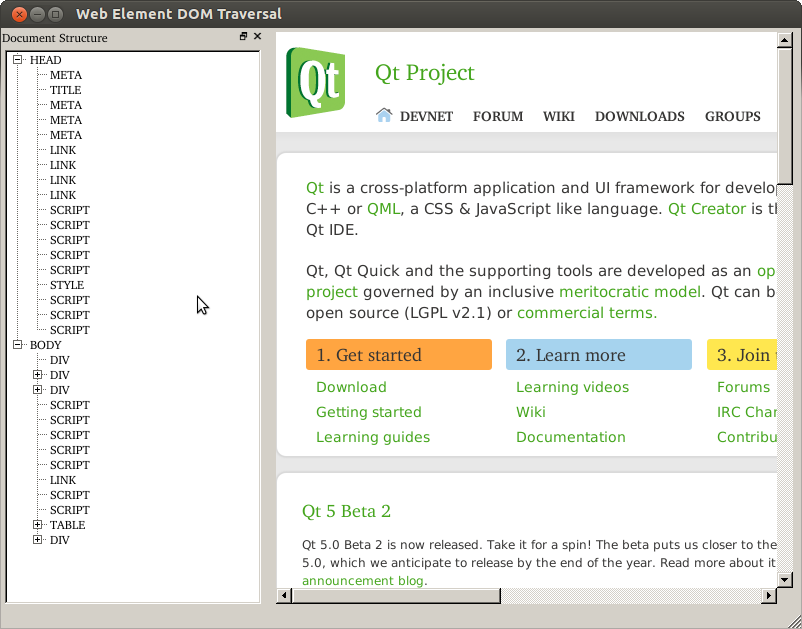 When the application's event loop is run, the Qt home page will load, and the tree widget will be updated to show the document structure. Navigating to another page will cause the tree widget to be updated to show the document structure of the new page.