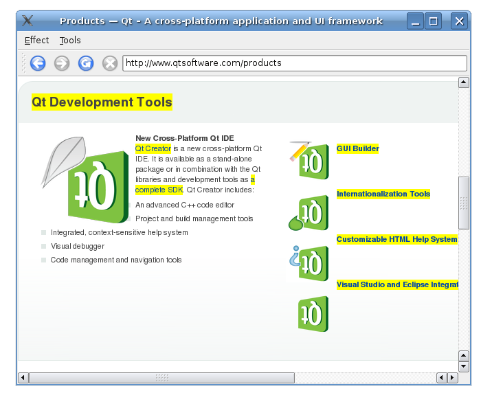 The application makes use of QWebFrame::evaluateJavaScript to evaluate the jQuery JavaScript code. A QMainWindow with a QWebView as central widget builds up the browser itself.