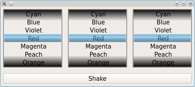 To demonstrate how to use the QScroller we implement a QWidget that looks and works like the wheel of a slot machine. The wheel can be started via touch events and will continue getting slower. Additionally the wheel should appear as if no border exists (which would seem unnatural) and the scrolling should snap to center one item.