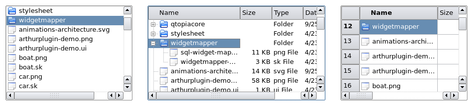 The QListView and QTreeView classes are the most suitable views to use with QFileSystemModel. The example presented below displays the contents of a directory in a tree view next to the same information in a list view. The views share the user's selection so that the selected items are highlighted in both views.