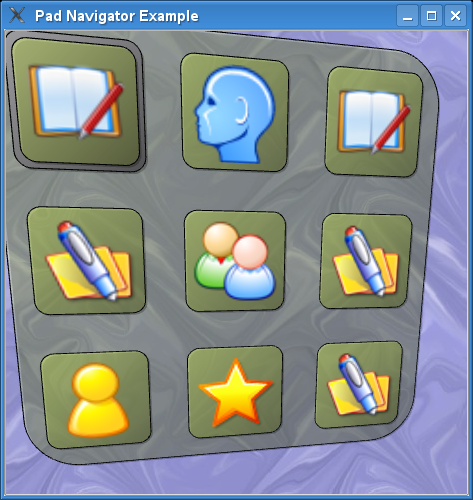 The interface consists of a flippable, rotating pad with icons that can be selected using the arrow keys on your keyboard or keypad. Pressing enter will flip the pad around and reveal its back side, which has a form embedded into a QGraphicsProxyWidget. You can interact with the form, and press the enter key to flip back to the front side of the pad at any time.