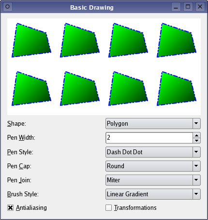 The example provides a render area, displaying the currently active shape, and lets the user manipulate the rendered shape and its appearance using the QPainter parameters: The user can change the active shape (Shape), and modify the QPainter's pen (Pen Width, Pen Style, Pen Cap, Pen Join), brush (Brush Style) and render hints (Antialiasing). In addition the user can rotate a shape (Transformations); behind the scenes we use QPainter's ability to manipulate the coordinate system to perform the rotation.