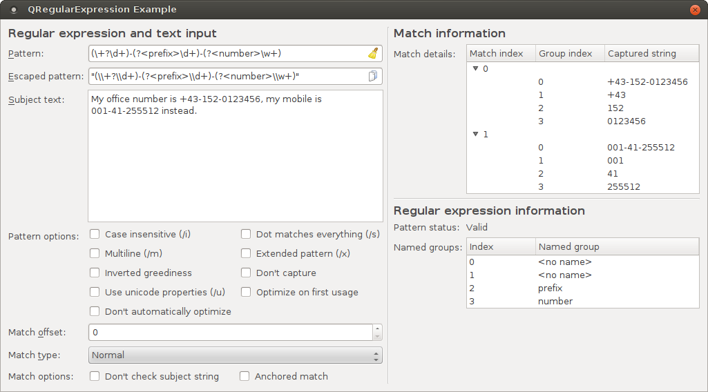 The example makes usage of the QRegularExpression class, which has been introduced in Qt 5.0. QRegularExpression implements Perl-compatible regular expressions, supporting a number of advanced matching features, such as case insensitive matching, multiline matching, Unicode properties selectors and partial/incremental matching.