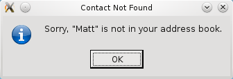 We then proceed to extract the search string, which in this case is contactName, using FindDialog's getFindText() function. If the contact exists in our address book, we display it immediately. Otherwise, we display the QMessageBox shown below to indicate that their search failed.