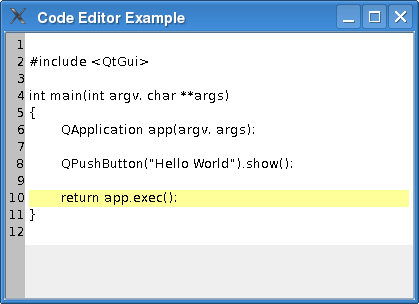 We implement the editor in CodeEditor, which is a widget that inherits QPlainTextEdit. We keep a separate widget in CodeEditor (LineNumberArea) onto which we draw the line numbers.