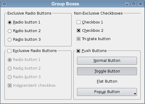QGroupBox *Window::createPushButtonGroup() { QGroupBox *groupBox = new QGroupBox(tr("&Push Buttons")); groupBox->setCheckable(true); groupBox->setChecked(true);