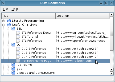 The DOM Bookmarks example provides a reader for XML Bookmark Exchange Language (XBEL) files that uses Qt's DOM-based XML API to read and parse the files. The SAX Bookmarks example provides an alternative way to read this type of file.